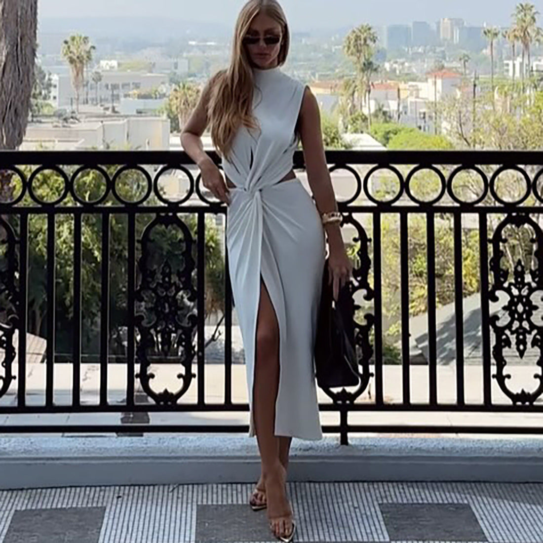 The thigh-high slit brings a daring edge to the refined shape, offering a glimpse of leg with every step. Whether you're stepping into a rooftop soirée, a luxury dinner, or an upscale evening event, this dress makes a powerful statement without saying a word. It's a flawless blend of elegance and seduction, tailored for the confident woman.