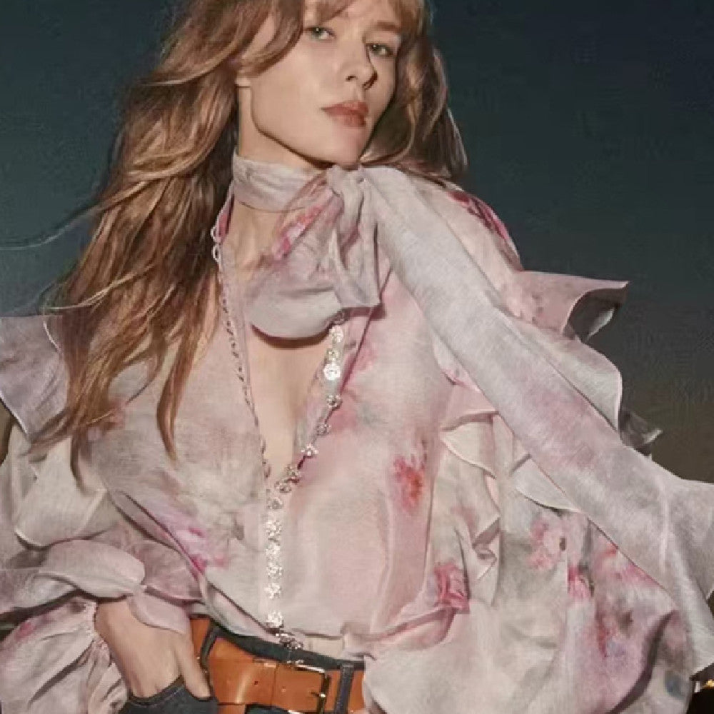 Romantic yet striking, this sheer ruffle blouse is a celebration of texture, movement, and sophisticated femininity. Crafted from an ethereal, lightweight fabric, it features cascading ruffles along the sleeves and bodice that add sculptural elegance to the silhouette. The voluminous design is balanced by a delicate tie-neck detail that can be styled into a soft bow or left to drape, offering a sense of timeless drama.
